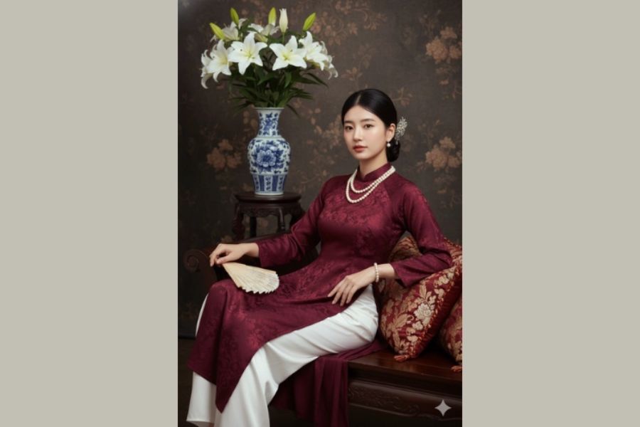 Giữ nguyên khuôn mặt và thần thái trong ảnh đã tải lên. Tạo một bức chân dung cổ điển, thanh lịch của phụ nữ Việt Nam trẻ đẹp, đứng thướt tha, hai tay cầm quạt, toát lên vẻ thoải mái, thư giãn. Cô mặc áo dài Tây Nam Bộ màu đỏ đô từ vải gấm sang trọng, quần lụa trắng, kết hợp chuỗi hạt ngọc trai, mặt dây chuyền, hoa tai và vòng tay đồng chất liệu. Mái tóc đen rẽ ngôi 7:3, búi thấp gọn gàng, phong cách cổ điển, cài trâm bạc khắc hoa văn cổ. Phía sau là đôn gỗ sẫm màu đặt bình sứ xanh trắng với bó hoa loa kèn trắng. Nền là tường tối kiểu Pháp thuộc, có kết cấu, tạo bầu không khí hội họa tinh tế. Ánh sáng studio, chân thực, chi tiết cao, 8K.