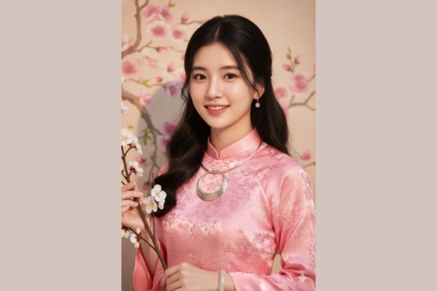 Sử dụng 100% khuôn mặt tải lên làm tham chiếu, giữ nguyên kết cấu da, tông màu và đường nét tự nhiên. Chân dung 8K, tỷ lệ 9:16, phụ nữ Việt Nam trẻ trung, da trắng hồng. Mái tóc đen dài buộc hờ, lọn tóc mềm mại buông quanh khuôn mặt. Đôi mắt to tròn, hàng mi cong tự nhiên, biểu cảm vui tươi, đáng yêu. Trang phục: áo dài lụa hồng truyền thống, họa tiết hoa tinh tế, cổ áo tinh chỉnh đẹp mắt. Phụ kiện: vòng cổ kim loại tròn kiểu Việt Nam cổ, hoa tai bạc nhỏ, vòng ngọc bích. Cô cầm cành mai trắng tượng trưng mùa xuân. Bối cảnh: tranh tường hoa đào mờ pastel hồng và be, ánh sáng ấm áp chiếu lên khuôn mặt và áo dài, hiệu ứng bokeh nhẹ, tạo cảm giác mơ màng, thơ mộng.