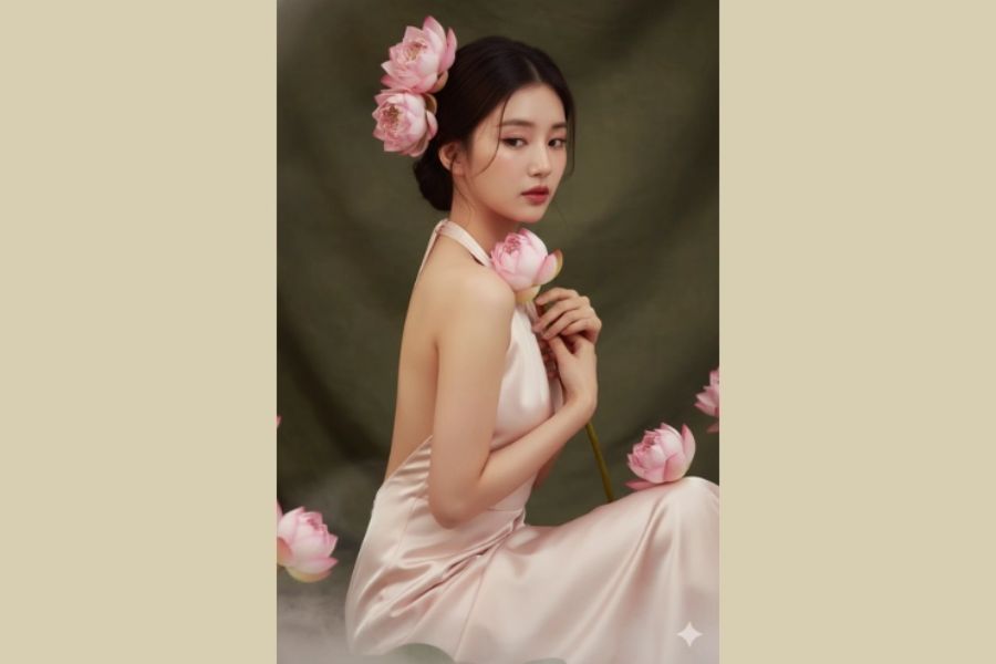 Giữ nguyên khuôn mặt và biểu cảm trong ảnh tham chiếu, tông da và kết cấu tự nhiên. Chân dung nghệ thuật, phụ nữ trẻ ngồi nghiêng nhẹ về phải, cầm hoa sen hồng-trắng gần ngực. Mái tóc búi thấp gọn gàng, cài hai bông sen hồng lớn, vài lọn tóc mềm rơi quanh má. Váy halter lụa hồng nhạt trễ vai, chất liệu satin mềm mại, ôm cơ thể nhẹ nhàng. Makeup tinh tế: má hồng nhạt, mắt nâu tự nhiên, mi dài cong, môi hồng bóng. Nền olive xanh tối, bokeh nhẹ, một vài bông sen xung quanh tạo không khí lãng mạn. Ánh sáng studio ấm áp, key light từ trái, fill nhẹ phải, backlight viền tóc. Mood: thơ mộng, thanh lịch, cinematic, pastel, hiệu ứng nhẹ glow và soft-focus.