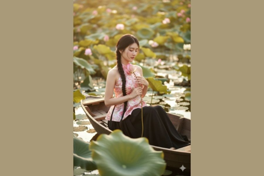 Giữ nguyên khuôn mặt, mắt, mũi, miệng. Phụ nữ trẻ ngồi trên thuyền gỗ nhỏ giữa đầm sen, tay nhẹ nhàng cầm cành sen trước mặt. Một vài lá sen che một góc, tạo cảm giác chụp lén nhẹ nhàng. Cô mặc áo yếm không tay cổ điển, vai và lưng trần, họa tiết hoa phức tạp, màu hồng nhạt và trắng trên vải lụa/gấm hơi bóng. Phần dưới váy ống loe rộng màu đen. Makeup nhẹ nhàng, má ửng hồng, tóc đen dài buông qua eo. Biểu cảm thanh tao, dịu dàng, động tác uyển chuyển như nàng thơ, tổng thể nhẹ nhàng và thơ mộng.