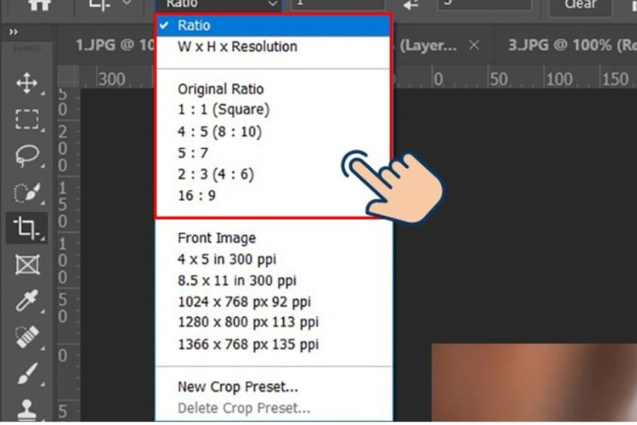 Tiếp theo, bạn cần thiết lập tỷ lệ khung hình trước khi tiến hành cắt ảnh. Trên thanh tùy chọn phía trên, hãy nhấp vào mục Ratio để lựa chọn tỷ lệ mong muốn. Photoshop cung cấp nhiều tùy chọn như Original Ratio (giữ nguyên tỷ lệ gốc), 1:1 (ảnh vuông), hoặc W x H x Resolution nếu bạn muốn nhập kích thước cụ thể theo nhu cầu sử dụng.