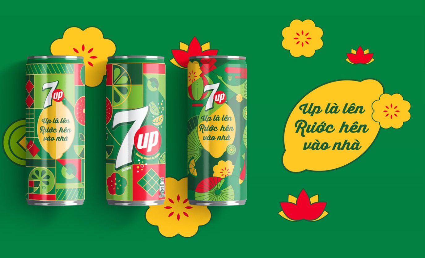 Trái ngược với vẻ rực rỡ và sang trọng của Pepsi, 7Up lựa chọn hướng đi nhẹ nhàng hơn nhưng không kém phần tinh tế. Bộ bao bì Tết 2026 mang thông điệp “Sáng khoái du xuân”, tập trung vào cảm giác tươi mới, tự do và hành trình khám phá mùa lễ hội.