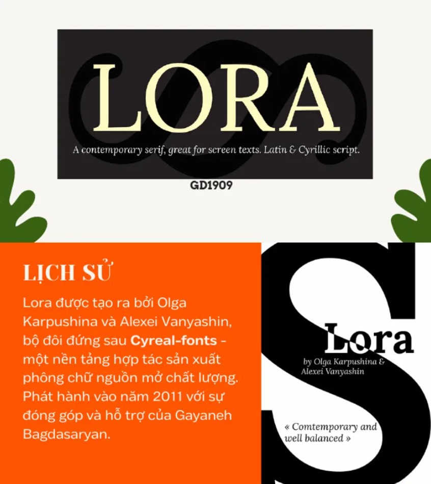 Năm 2025, Lora tiếp tục nằm trong danh sách font được yêu thích bởi khả năng hiển thị đẹp trên cả màn hình và bản in. Đây là lựa chọn lý tưởng cho blog, tạp chí, website thương hiệu cao cấp hoặc các dự án cần sự tinh tế.