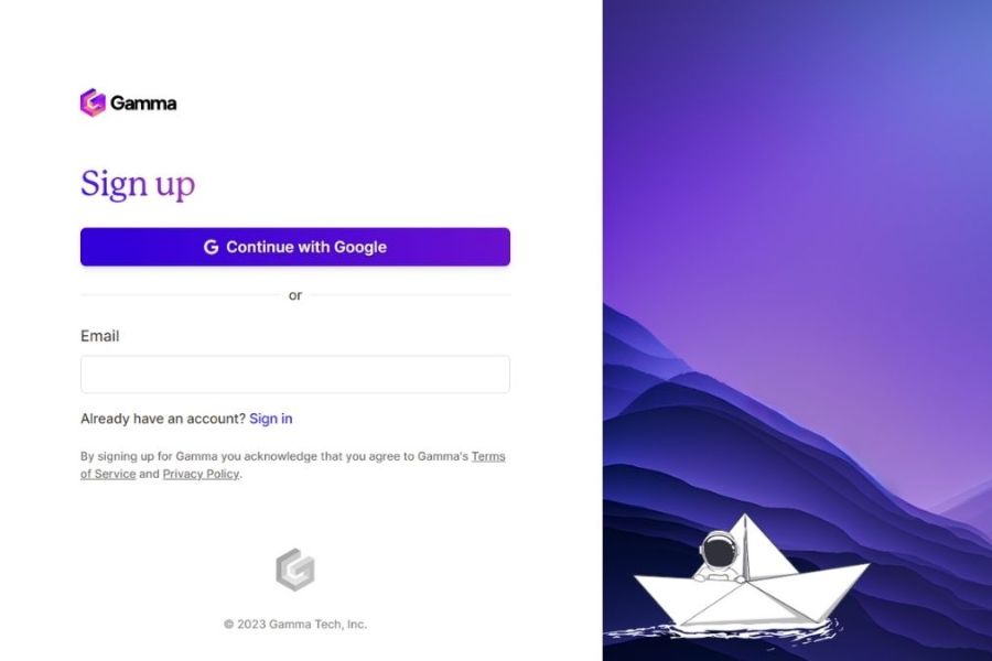 Để bắt đầu tạo bài thuyết trình bằng Gamma AI, bạn cần truy cập vào trang web chính thức của nền tảng. Tại đây, bạn có thể đăng ký một tài khoản mới bằng email hoặc đăng nhập nhanh qua Google. Việc tạo tài khoản giúp bạn lưu trữ bài thuyết trình, đồng bộ dữ liệu và dễ dàng quản lý các dự án đã thực hiện trước đó.