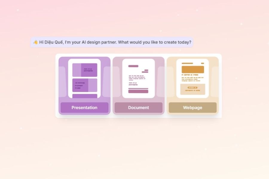 Khi chọn Tạo mới, bạn sẽ được yêu cầu lựa chọn định dạng phù hợp với mục đích sử dụng. Nếu bạn muốn tạo bài thuyết trình, hãy chọn Presentation. Bên cạnh đó, Gamma AI còn hỗ trợ tạo tài liệu và giao diện trang web, giúp bạn linh hoạt sản xuất nội dung tùy theo nhu cầu công việc hoặc học tập.