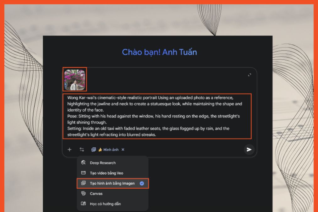 Gemini hiểu tốt nhất khi bạn dùng tiếng Anh. Các từ khóa như “cinematic lighting”, “Wong Kar-wai style”, “retro Hong Kong portrait” là gợi ý hữu ích.