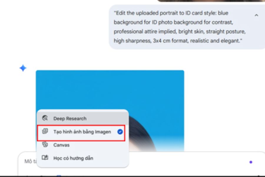 Khi ảnh đã tải lên, bạn chỉ cần copy – paste một trong những prompt mẫu ở phần trên vào ô chat. Gemini sẽ bắt đầu xử lý và hiển thị ảnh xem trước chỉ sau vài giây. Lúc này, hệ thống AI sẽ tự động căn chỉnh khuôn mặt, thay đổi phông nền, điều chỉnh ánh sáng, làn da và các chi tiết nhỏ để tạo ra bức ảnh thẻ hoàn chỉnh.