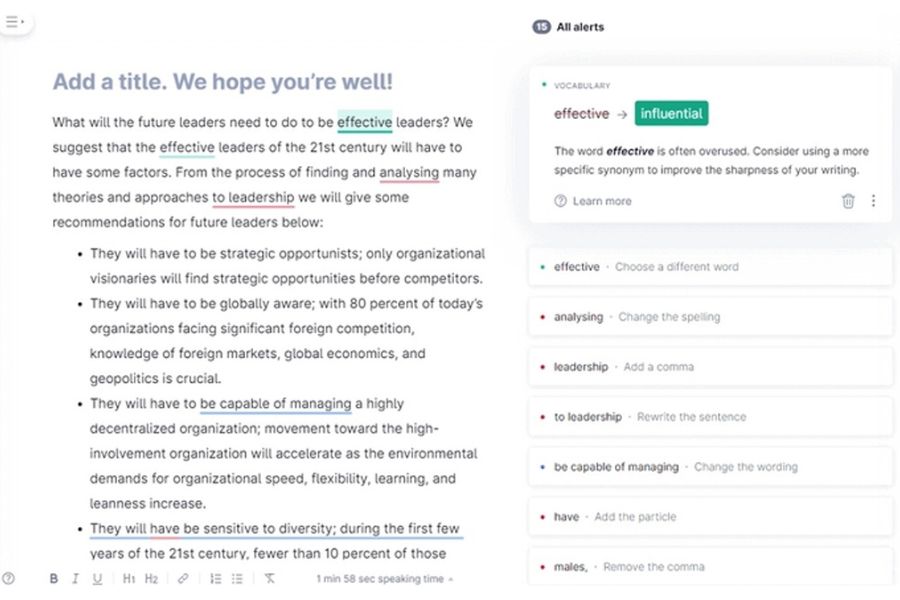 Hỗ trợ học tập và tự cải thiện kỹ năng: Grammarly không chỉ sửa lỗi mà còn đóng vai trò như “gia sư ngữ pháp” khi giải thích nguyên nhân sai, đề xuất từ đồng nghĩa và giúp người dùng học từ vựng mới ngay trong quá trình viết.