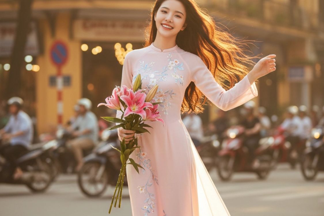 A full-length cinematic portrait of a young Vietnamese woman wearing an elegant pastel embroidered ao dai, flowing softly with each step. She walks gracefully along a classic Hanoi street during golden hour, her posture light and feminine, radiating confidence and warmth. Her bright, natural smile captures the gentle spirit of a Hanoi muse.