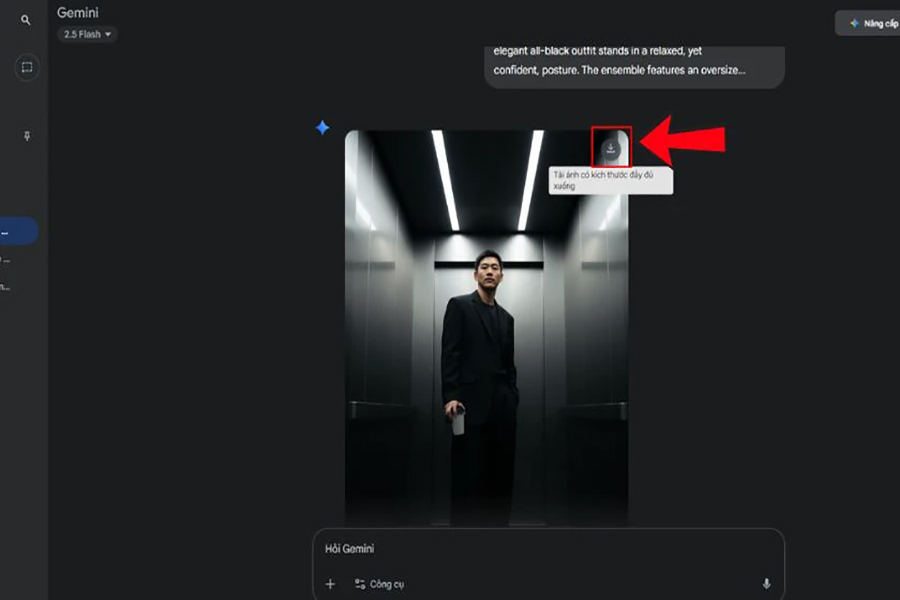 Sau đó, nhập câu lệnh chi tiết mô tả bối cảnh trong thang máy. Cụ thể: “Inside a sleek, dimly lit modern elevator, a person in an elegant all-black outfit stands in a relaxed, yet confident, posture. The ensemble features an oversized, structured blazer and long, soft-draping pants, showcasing subtle fabric textures. The person holds a simple takeaway coffee cup. The elevator's polished, almost liquid-like metal walls reflect the muted light from the linear neon ceiling fixtures, casting soft, dramatic shadows that enhance the edgy and mysterious vibe”