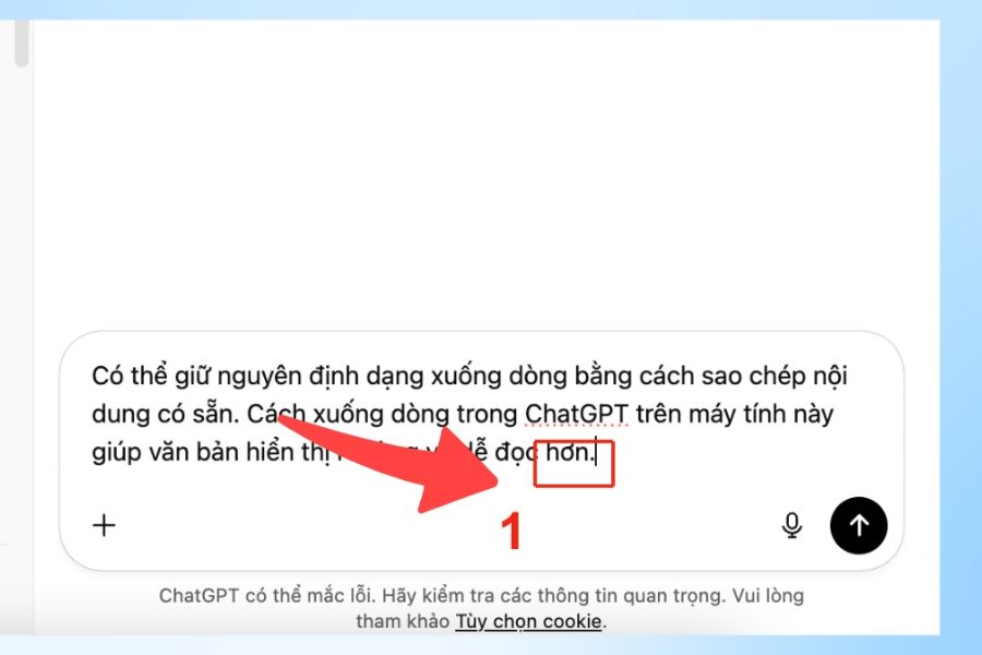 Xuống dòng khi nhập nội dung trên máy tính là cách đơn giản nhưng cực kỳ hiệu quả để giúp văn bản trở nên rõ ràng và dễ đọc hơn. Khi bạn biết cách tận dụng thao tác này, mọi đoạn văn sẽ được phân tách hợp lý, tránh tình trạng dính chữ gây khó hiểu. Dưới đây là hai cách phổ biến và dễ áp dụng nhất mà bạn có thể sử dụng ngay trong quá trình làm việc với ChatGPT.