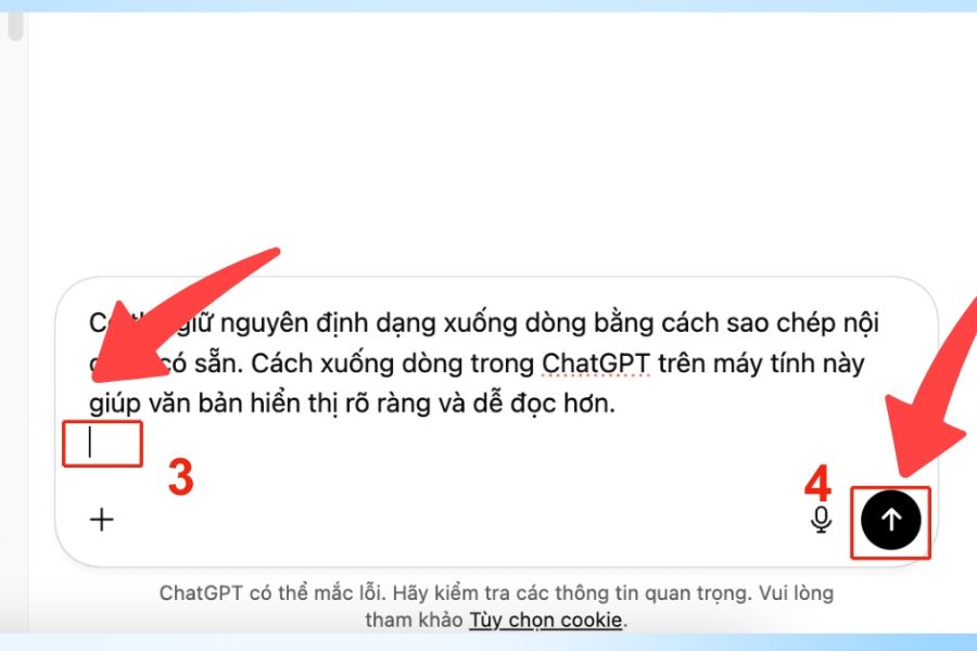 Tiếp theo, bạn mở ChatGPT và dán nội dung vào ô nhập. Toàn bộ các dòng đã xuống trước đó sẽ được giữ nguyên, giúp văn bản hiển thị rõ ràng hơn. Trước khi gửi, bạn nên đọc lại một lần để kiểm tra bố cục. Nếu cần, bạn có thể chỉnh sửa nhẹ rồi nhấn gửi để hoàn tất quá trình.