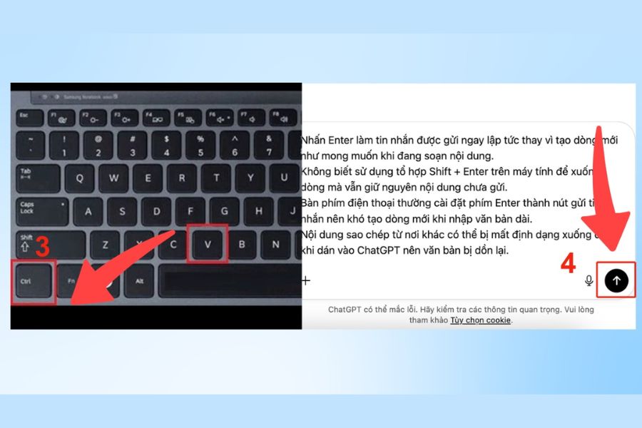 Tiếp theo, bạn chuyển sang giao diện ChatGPT và nhấn Ctrl + V để dán nội dung vào ô nhập. Ngay lập tức, toàn bộ phần văn bản cùng các dòng ngắt sẽ được hiển thị đầy đủ. Trước khi gửi, hãy đọc lại một lần để kiểm tra xem các dòng đã hiển thị đúng như mong muốn chưa. Nếu cần, bạn có thể chỉnh sửa nhẹ để tối ưu bố cục, sau đó nhấn gửi để hoàn tất.