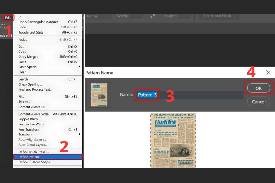 Sau khi đã có vùng chọn, bạn vào menu Edit và chọn Define Pattern. Một hộp thoại sẽ xuất hiện, lúc này bạn hãy đặt tên cho pattern mới sao cho dễ nhớ và dễ quản lý, sau đó nhấn OK để hoàn tất.