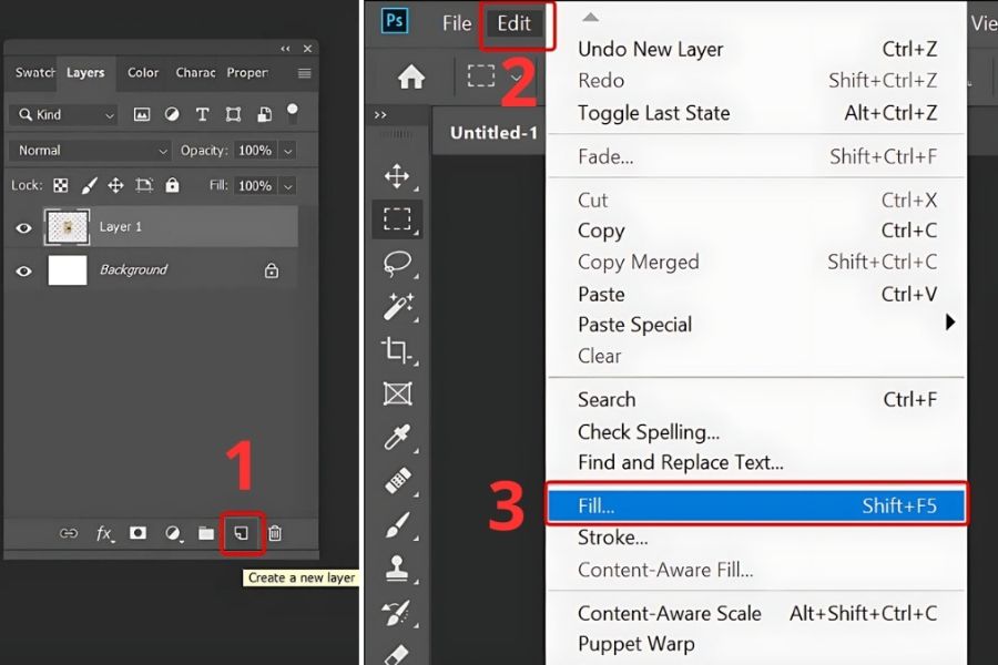Sau đó, vào menu Edit và chọn Fill. Đây là công cụ cho phép bạn đổ nội dung vào layer mới bằng màu sắc, pattern hoặc các hiệu ứng khác, rất hữu ích trong quá trình tạo pattern Photoshop.