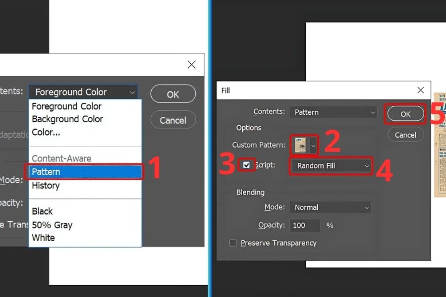 Trong hộp thoại Fill, tại mục Contents, bạn chọn Pattern và mở Custom Pattern để tìm pattern vừa tạo. Tiếp theo, bạn tích vào mục Script và chọn kiểu Random Fill để Photoshop tự động sắp xếp họa tiết theo dạng ngẫu nhiên.