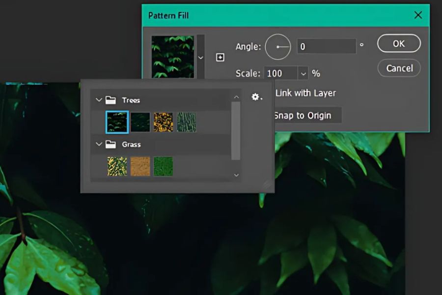 Pattern: Nhấn vào danh sách thả xuống để chọn họa tiết phù hợp từ thư viện pattern của Photoshop.
