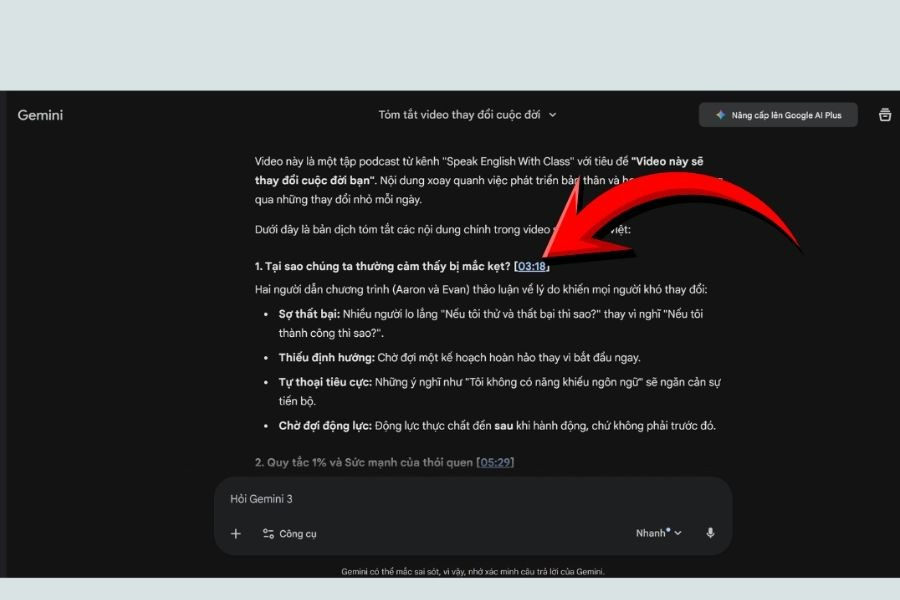 Sau vài giây xử lý, Gemini AI sẽ trả về bản dịch của video theo từng câu hoặc từng đoạn thoại, đi kèm mốc thời gian cụ thể tương ứng trong video gốc. Đây là điểm mạnh nổi bật khi dịch video bằng Gemini so với nhiều công cụ dịch thông thường.