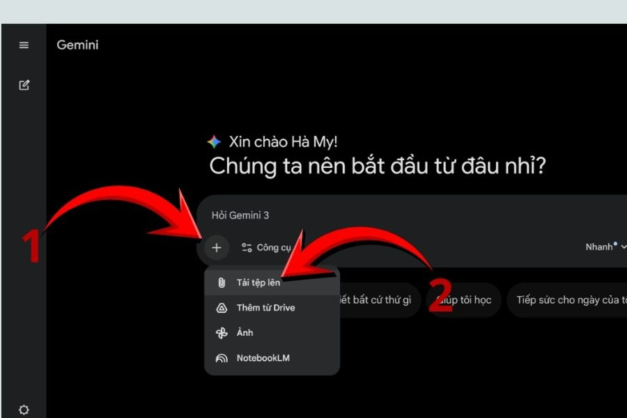Trong trường hợp bạn có sẵn video lưu trong máy (ví dụ: video đào tạo nội bộ, video quay tay, video từ khách hàng), hãy nhấn vào biểu tượng dấu “+” bên cạnh khung nhập để tải tệp video lên. Gemini hỗ trợ nhiều định dạng phổ biến, giúp quá trình tải lên diễn ra nhanh và ổn định.