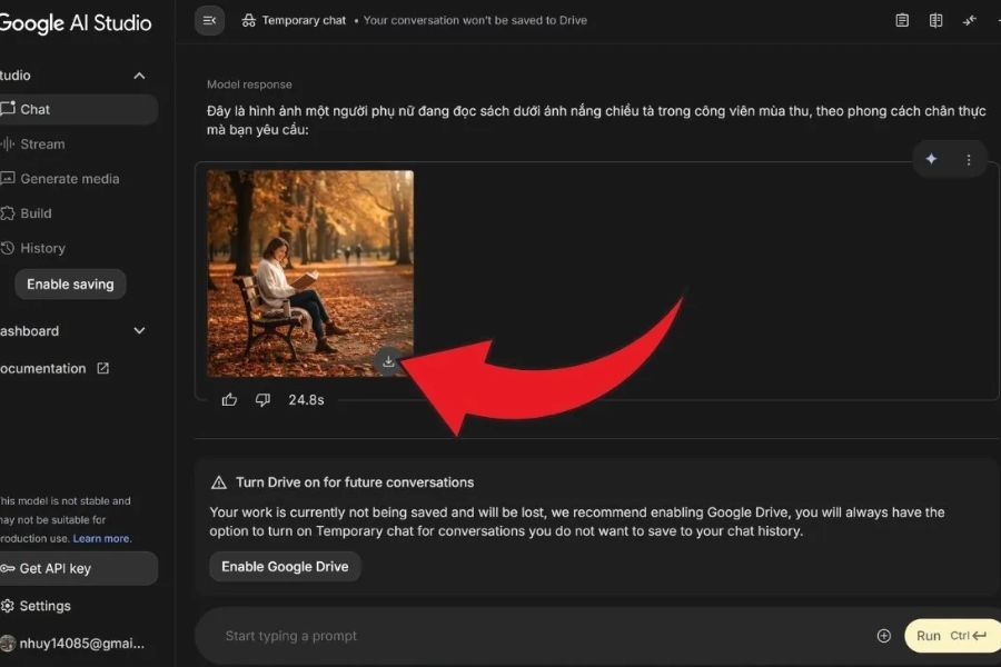 Việc bắt đầu dự án trong AI Studio rất trực quan: bạn có thể theo dõi tiến trình, quản lý các module AI và thử nghiệm các tính năng khác nhau mà không gặp rào cản kỹ thuật. Đây là môi trường lý tưởng để học hỏi, thử nghiệm và phát triển các ý tưởng sáng tạo bằng công cụ Nano Banana.