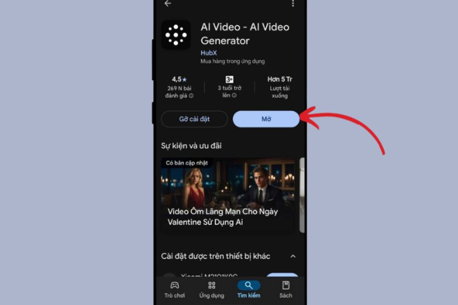Đầu tiên, bạn hãy truy cập Google Play Store (đối với Android) hoặc App Store (đối với iPhone), sau đó tìm kiếm ứng dụng “AI Video – AI Video Generator”. Khi ứng dụng hiển thị, hãy nhấn Tải xuống và đợi hệ thống hoàn tất quá trình cài đặt. Đây là bước quan trọng để chuẩn bị cho quá trình tạo video vì toàn bộ thao tác sau đó sẽ được thực hiện trực tiếp trong ứng dụng này.