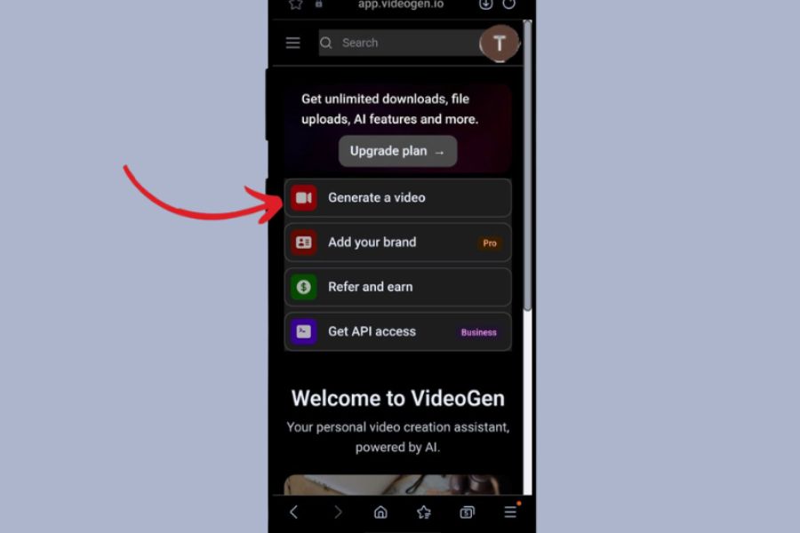 Khi đã hoàn tất phần thiết lập ban đầu, bạn sẽ được đưa đến giao diện chính của ứng dụng. Tại đây, bạn hãy tìm và nhấn vào mục “Generate a video”. Đây là tính năng trung tâm giúp bạn tạo ra bất kỳ video nào bằng AI, từ video chúc mừng 8/3 cho đến video quảng bá, video kỷ niệm hoặc thậm chí là video kể chuyện.