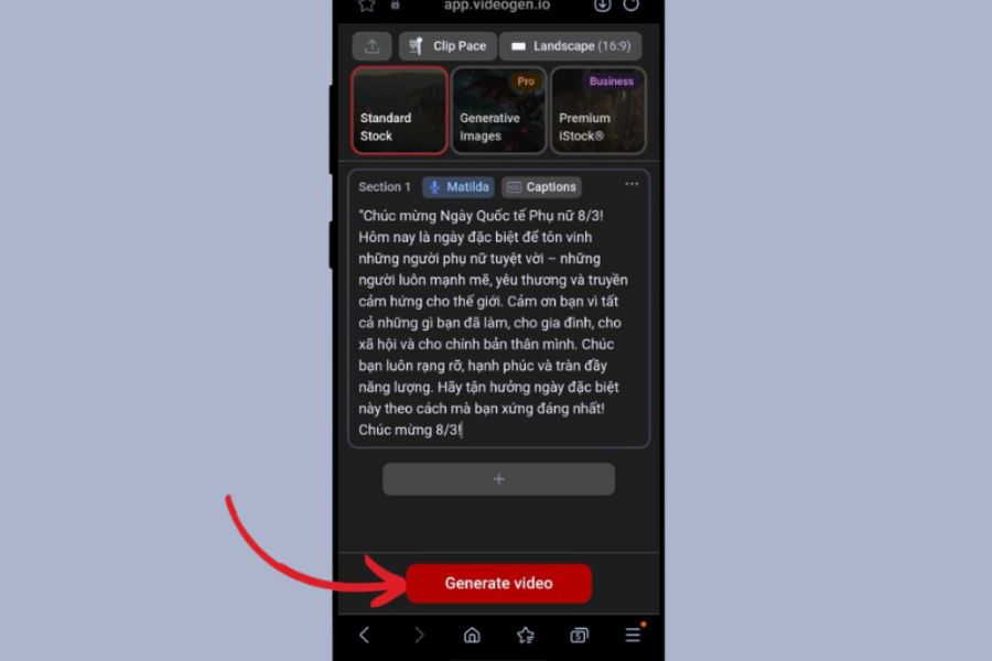Khi đã hoàn thành mô tả, bạn chỉ cần nhấn vào “Generate video” và đợi AI xử lý. Trong vài giây đầu, hệ thống sẽ tiến hành phân tích yêu cầu, lựa chọn hình ảnh, dựng chuyển cảnh và ghép nhạc phù hợp với chủ đề 8/3.