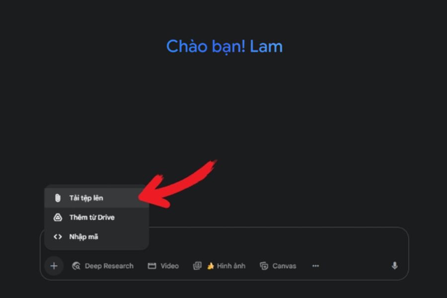 Sau khi vào giao diện tạo ảnh, bạn nhấn vào biểu tượng dấu (+) nằm bên dưới khung chat. Tiếp theo, chọn “Tải tệp lên” để đăng tải bức ảnh bạn muốn dùng làm hình tham chiếu. Lưu ý, ảnh tải lên cần có gương mặt rõ nét, ánh sáng đều, không bị nhòe hoặc tối. Ảnh càng chất lượng thì kết quả Gemini tạo ra càng tự nhiên và chính xác.