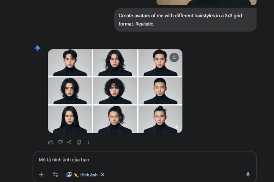 Sau vài giây xử lý, Gemini AI sẽ hiển thị hình ảnh mới với các kiểu tóc khác nhau mà bạn có thể so sánh trực tiếp. Mỗi phiên bản đều có ánh sáng và độ chân thực cao, giúp bạn dễ dàng nhận ra kiểu tóc nào phù hợp nhất với khuôn mặt. Đây chính là điểm mạnh khiến người dùng yêu thích Gemini hình ảnh không bị giả hay méo như nhiều công cụ chỉnh sửa khác.