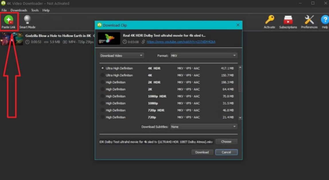 Mở phần mềm và chọn Paste Link. Công cụ sẽ tự động phân tích video và đưa ra danh sách định dạng và độ phân giải.