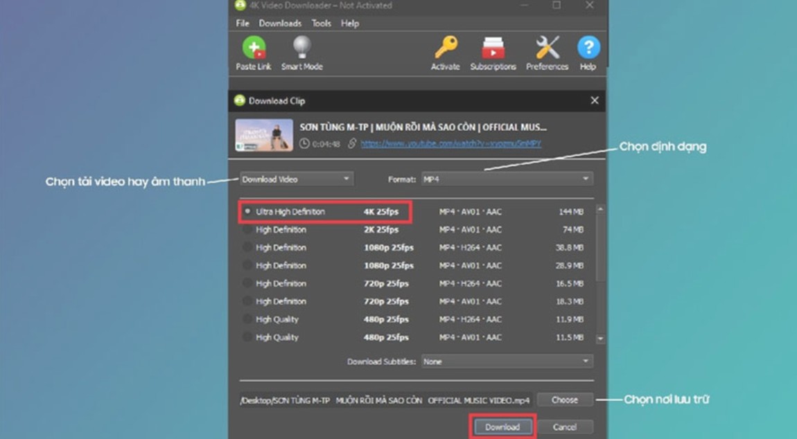 Quay lại website và dán link vào ô tương ứng. Sau khi hệ thống xử lý video, bạn sẽ thấy danh sách độ phân giải. Chọn video có chất lượng 4K, sau đó nhấn Download.