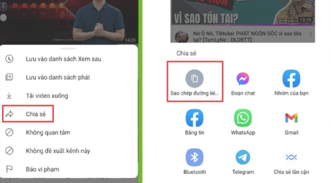 Mở video YouTube muốn tải và sao chép link bằng nút Chia sẻ → Sao chép liên kết.