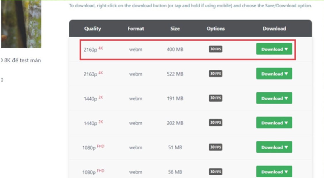 Sau khi bấm tải, danh sách độ phân giải sẽ xuất hiện. Bạn chỉ cần chọn 2160p để video được tải về ở chất lượng 4K.