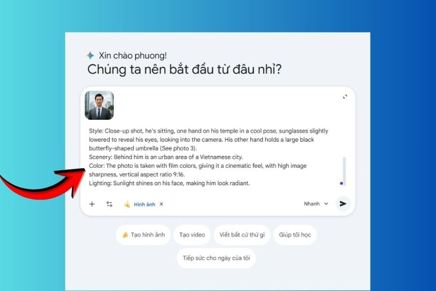 Ngay sau khi chọn xong, Gemini sẽ chuyển sang chế độ chuyên tạo ảnh. Lúc này, bạn không chỉ nhập mô tả bằng văn bản mà còn có thể tải ảnh khuôn mặt lên để AI sử dụng làm dữ liệu gốc. Đây là bước quan trọng để đảm bảo hệ thống hiểu rằng bạn đang muốn tạo một hình ảnh mới với gương mặt thật của mình.