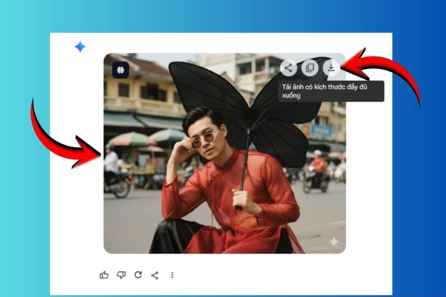 Khi ảnh được tạo xong, Gemini sẽ hiển thị kết quả trực tiếp trên màn hình. Bạn có thể phóng to để kiểm tra chi tiết khuôn mặt, nếp vải áo dài, hiệu ứng ánh sáng và chiều sâu của bối cảnh.