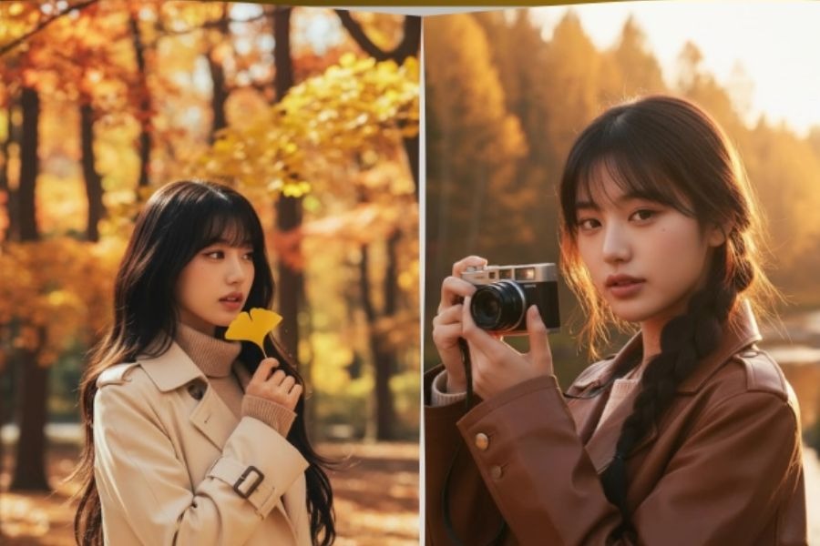 Kết quả: Bạn sẽ có một bức ảnh mùa thu với ánh nắng vàng nhẹ, tán lá rơi bồng bềnh và biểu cảm gương mặt tự nhiên như được chụp giữa rừng phong lá đỏ.