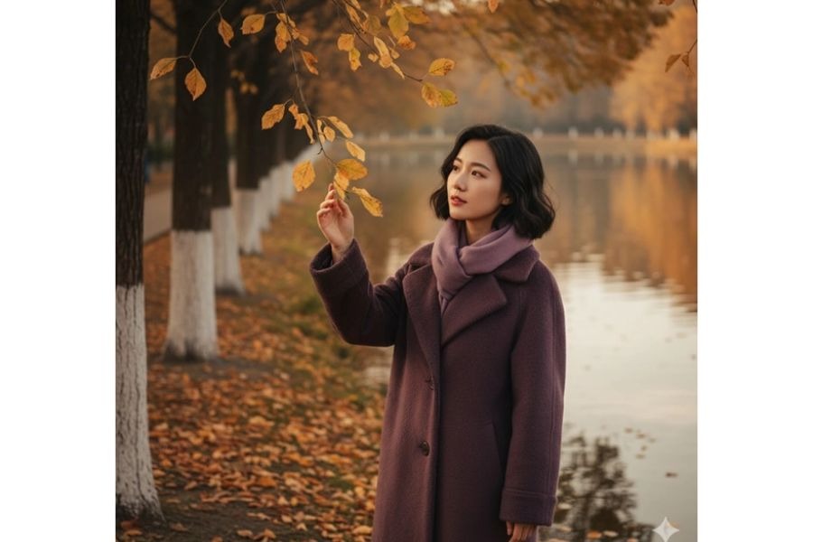 Phong cách cổ điển: Trench coat thanh lịch, chiếc khăn tím nhạt quấn hờ, mặt hồ phản chiếu sắc thu vàng dịu. Cảm giác như bạn đang lạc bước giữa Paris mùa lá rụng, nơi thời gian trôi chậm và mọi khung hình đều đượm hương vị hoài cổ.
