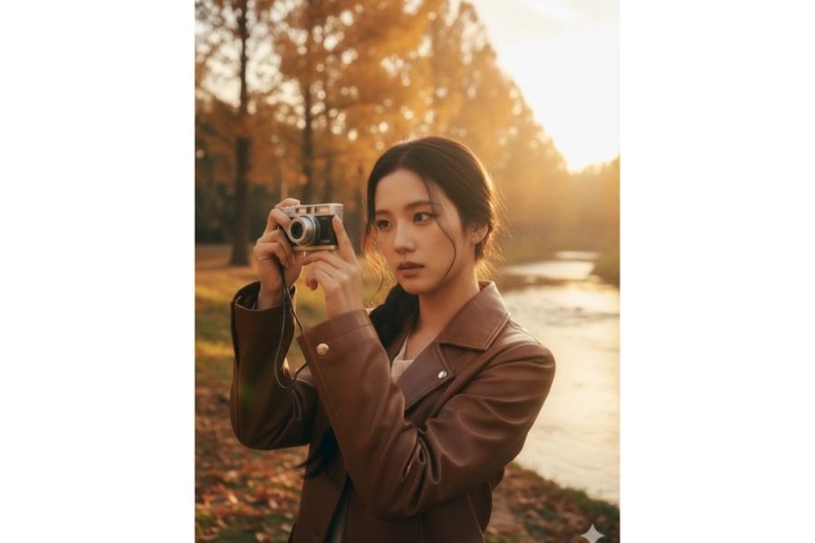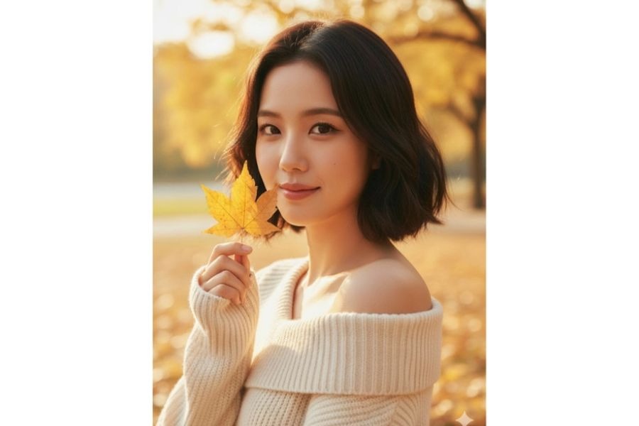 Phong cách nhẹ nhàng: Hãy tưởng tượng ánh nắng vàng rót xuống vai, mái tóc khẽ bay trong gió, chiếc áo len màu kem ôm dáng cùng nụ cười dịu. Vài chiếc lá phong lượn qua nền trời mờ sương, tất cả tạo nên bức ảnh trong trẻo, tinh khôi mà vẫn chan chứa cảm xúc.