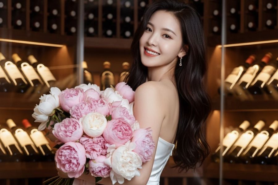 Create a realistic image based on the attached photo while keeping the face identical without changing the eyes, nose, or mouth. A glamorous woman stands inside a luxurious wine cellar surrounded by reflective walls filled with neatly arranged wine bottles. She is holding a very large bouquet of soft pink and white peonies that occupies most of the frame, decorated with elegant satin ribbons woven between the flowers.