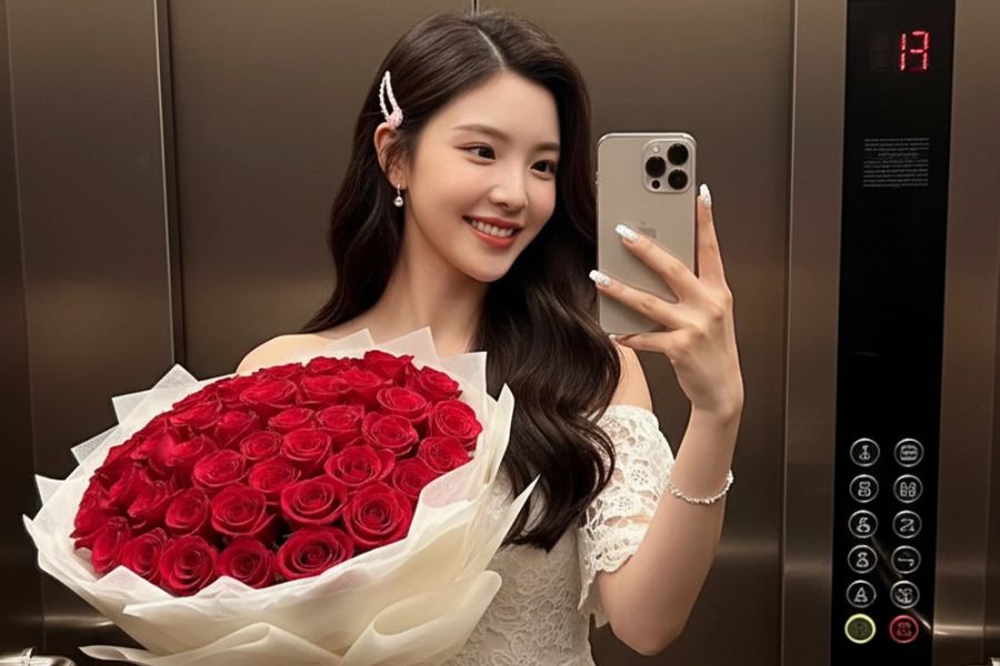 Cô đứng trong một thang máy sang trọng với các bức tường ốp vật liệu cao cấp màu nâu sẫm hoặc vàng đồng bóng loáng. Trong tay cô là một chiếc iPhone 17 Pro Max dùng để chụp ảnh selfie qua gương thang máy, cô mỉm cười hạnh phúc khi nhìn vào điện thoại. Cô cầm một bó hoa hồng đỏ lớn được xếp thành hình trái tim và bọc bằng giấy màu trắng kem. Bảng điều khiển thang máy lớn với nhiều nút bấm phản chiếu ánh sáng tạo nên khung cảnh hiện đại, sang trọng và đầy cảm xúc.