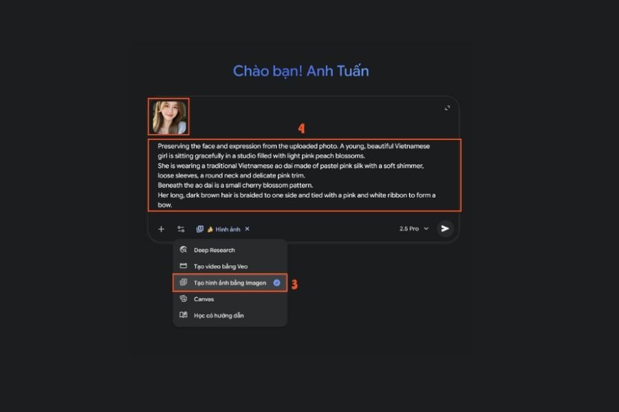 Sau khi tải ảnh lên thành công, đây là lúc bạn “ra lệnh” cho AI tạo nên bức ảnh Tết mơ ước. Trong ô nhập liệu, hãy sao chép và dán một câu lệnh mô tả (prompt) phù hợp, chẳng hạn như: “Ghép khuôn mặt trong ảnh vào một khung cảnh Tết Việt Nam, mặc áo dài đỏ, đứng bên hoa mai và phong bao lì xì, ánh sáng ấm áp, không khí vui tươi của mùa xuân.”