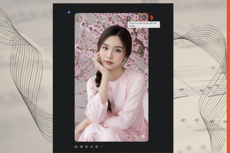 Khi Gemini AI hoàn tất quá trình tạo ảnh, bạn sẽ thấy những phiên bản ảnh Tết được hiển thị ngay trên màn hình. Hãy chọn bức ảnh mà bạn ưng ý nhất có thể là concept áo dài bên phố xuân, hoặc hình ảnh bên mai vàng, câu đối đỏ rực rỡ. Sau đó, nhấp vào biểu tượng Tải xuống (Download) để lưu hình ảnh chất lượng cao về máy.