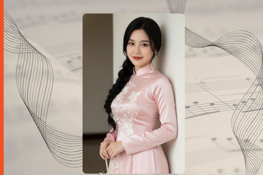 Giữ nguyên khuôn mặt và biểu cảm từ ảnh gốc. Một cô gái trẻ châu Á xinh đẹp đứng dịu dàng tựa vào bức tường sáng màu, khuôn mặt hướng về ống kính với đôi mắt sâu hút và bờ môi đỏ nhẹ. Cô khoác trên mình tà áo dài lụa hồng pastel mềm mại, được thêu hoa và mây tinh xảo, tạo nên cảm giác sang trọng và thanh thoát. Một tay cô buông nhẹ, tay còn lại cầm dây ngọc trai điểm xuyết vài nhành hoa lan trắng. Mái tóc đen óng được tết dày buông xuống ngang eo, vài sợi tóc buông lơi ôm lấy gương mặt. Ánh sáng ấm áp từ bên hông chiếu nhẹ làm nổi bật đường nét gương mặt và chất liệu lụa bóng mượt. Toàn bộ khung hình toát lên vẻ đẹp tinh tế, nữ tính và mang hơi thở Tết hiện đại pha nét truyền thống Việt.
