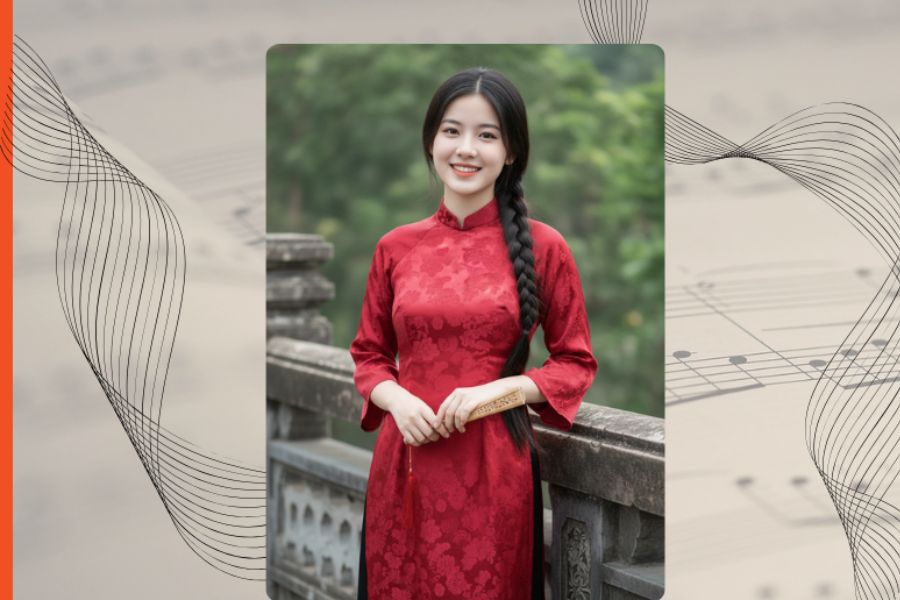 Giữ nguyên khuôn mặt và cảm xúc gốc. Cô gái trẻ châu Á xinh đẹp khoác lên mình tà áo dài gấm đỏ thẫm, chất liệu tơ gấm cao cấp được dệt hoa văn tinh tế. Áo cổ cao kiểu truyền thống, tay áo hơi loe nhẹ, tà áo buông dài tự nhiên để lộ chiếc quần lụa đen mềm mại bên trong. Cô cầm trên tay chiếc quạt tre khắc hoa văn cổ, mái tóc đen dày tết thành bím lớn buông ra phía trước. Cô đứng cạnh lan can đá cổ có chạm khắc tinh xảo, xung quanh là ánh sáng tự nhiên dịu nhẹ xen lẫn làn sương mờ, tạo cảm giác yên bình và hoài niệm. Từng chi tiết trong bức ảnh gợi lên vẻ đẹp cổ kính, sang trọng và đậm tinh thần Tết xưa.