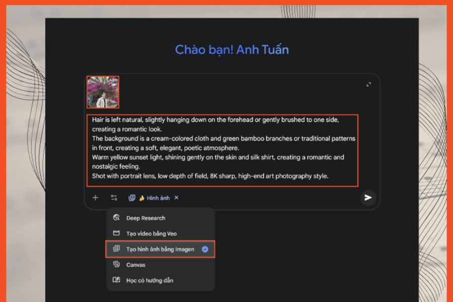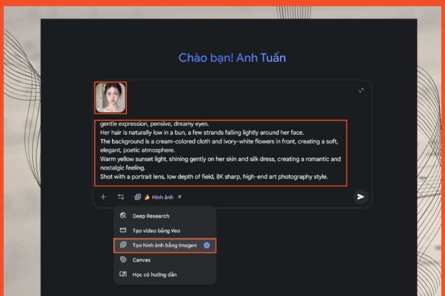 Đây chính là bước “phù phép” tạo nên linh hồn cho bức ảnh. Chỉ cần bạn nhập đúng câu lệnh (prompt) mô tả chi tiết phong cách, ánh sáng, bối cảnh và biểu cảm, Gemini sẽ dựa theo đó để tạo ra tác phẩm hoàn chỉnh.