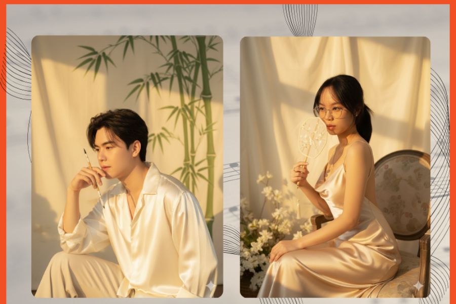 Bối cảnh đơn giản để làm nổi bật chủ thể: Nền ít chi tiết, tông màu trung tính hoặc họa tiết truyền thống nhẹ nhàng sẽ giúp hiệu ứng thơ mộng nổi bật hơn và giữ được sự tinh tế trong phong cách Đông Á.