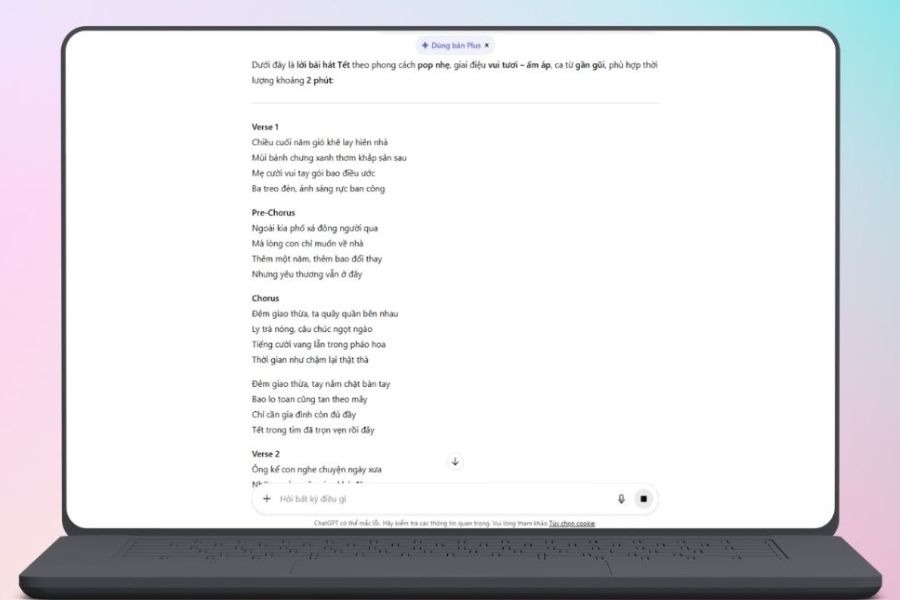 Với cách đặt prompt như vậy, ChatGPT có thể tạo ra lời bài hát có cấu trúc rõ ràng, dễ sử dụng cho các bước tạo nhạc bằng AI tiếp theo.
