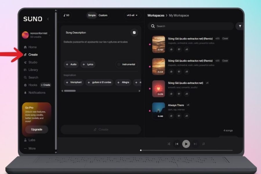 Tại giao diện chính, hãy nhấn vào mục Create để bắt đầu quá trình tạo nhạc. Suno thường cung cấp hai chế độ chính: tạo nhạc từ mô tả hoặc tạo nhạc từ lời bài hát có sẵn.