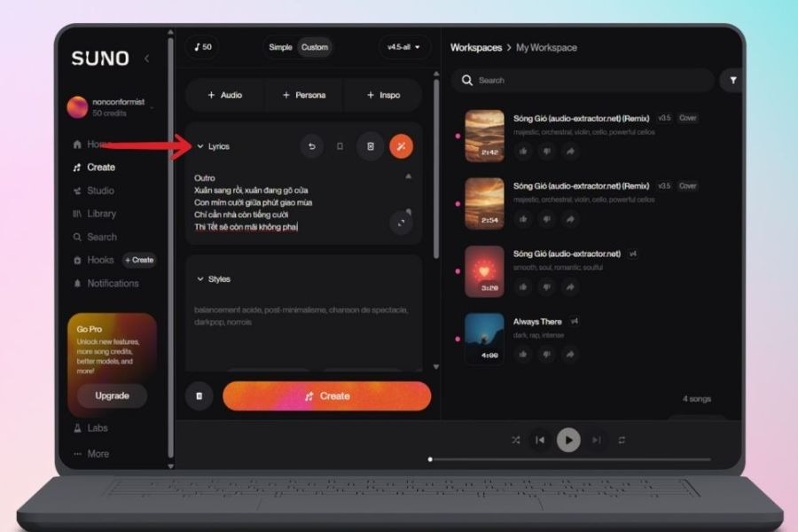 Tiếp theo, bạn dán toàn bộ lời bài hát Tết đã chuẩn bị vào mục Lyrics. Đây là phần quan trọng vì AI sẽ dựa vào nội dung này để tạo giai điệu và giọng hát phù hợp.