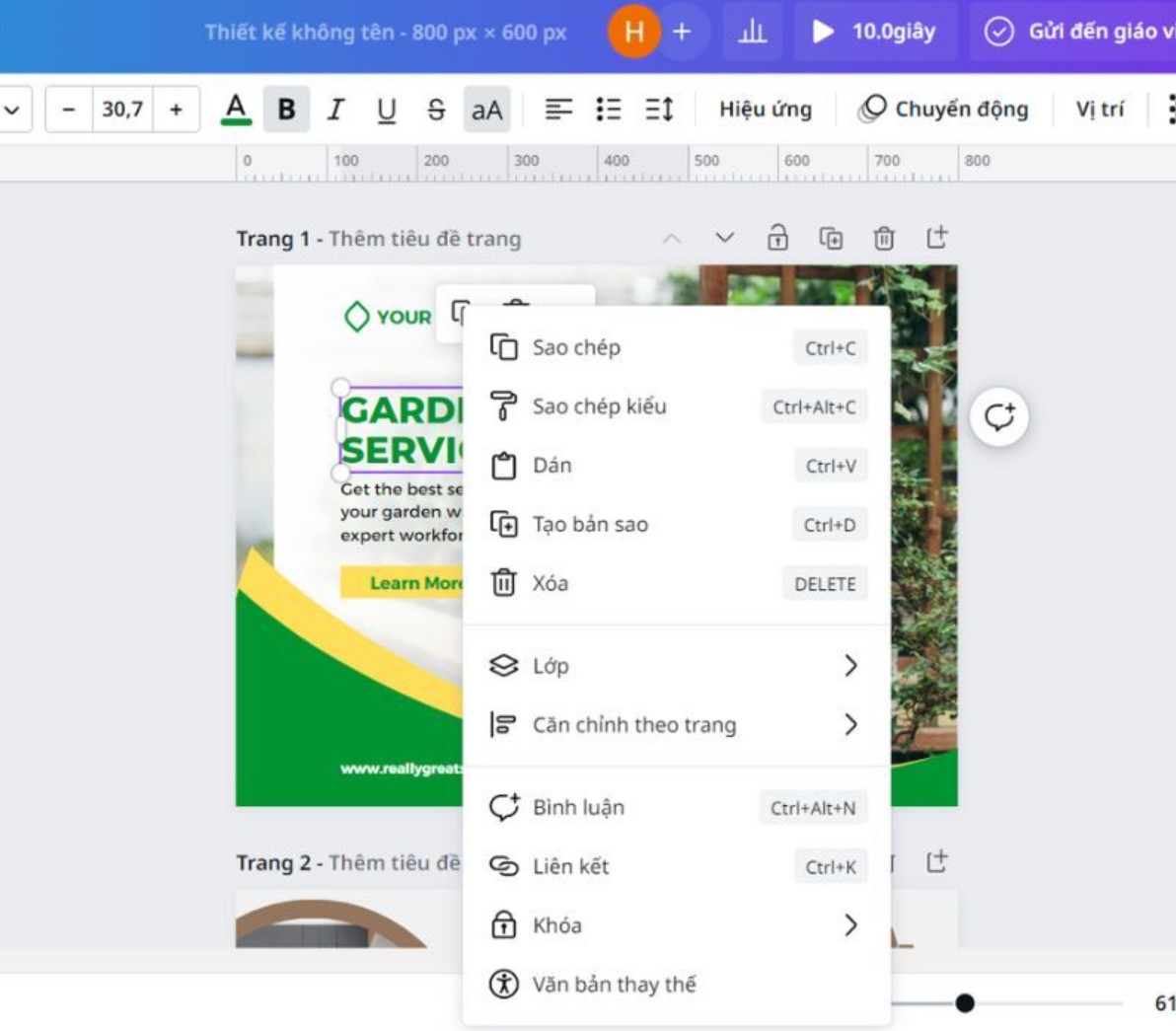 Ngoài các công cụ bên trái, Canva còn cho phép bạn thao tác nhanh bằng việc nhấn chuột phải vào đối tượng. Bạn có thể sao chép, cắt, nhân bản, khóa, xóa, căn chỉnh hoặc thay đổi thứ tự layer một cách trực tiếp và nhanh chóng. Đây là những thao tác cần làm quen để nâng cao tốc độ làm việc.